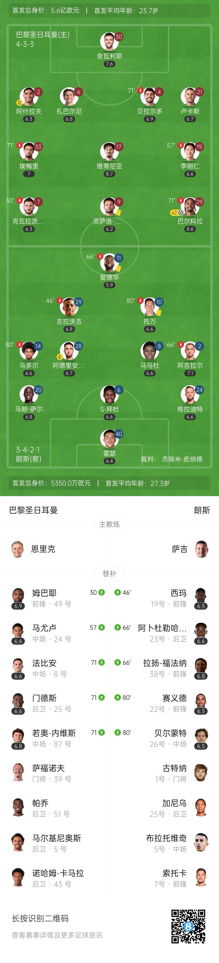 直播吧9月15日讯北京时分9月14日晚23时15分,2025-26赛季法甲第4轮在王子公园通顺场张开角逐,巴黎圣日耳曼主场迎战朗斯。上半场巴尔科拉兜射宇宙波,维蒂尼亚抢捐躯助攻,克瓦拉茨赫利亚伤退,下半场巴尔科拉双响+贴地斩,维蒂尼亚再送助攻,李刚和善贝拉尔多伤退。最终巴黎圣日耳曼主场2-0驯顺朗斯,巴黎联赛开局赢得4连胜领跑积分榜,巴黎本场3东说念主伤退+周中欧冠将对阵亚特兰大。