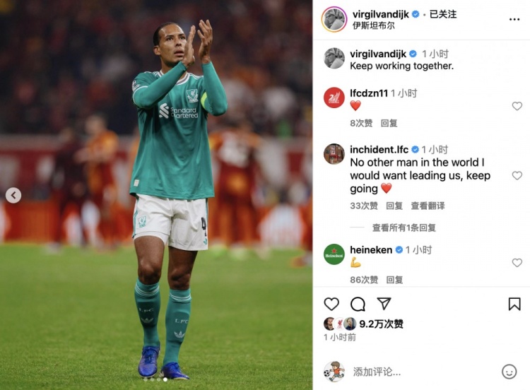 队长担当!范迪克社媒饱读吹球队:让咱们链接共同骁勇!