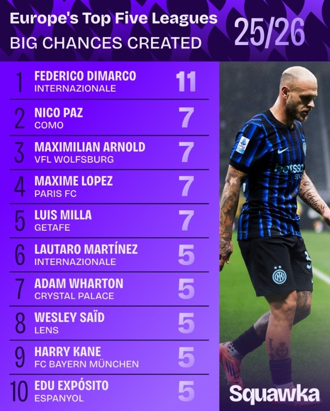10月17日讯 本周末,欧洲五大联赛将重燃战火。Squawka清点了本赛季五大联赛创造要紧契机情况,其中迪马尔科以11次居首,尼科-帕斯等4东谈主均7次紧随自后。