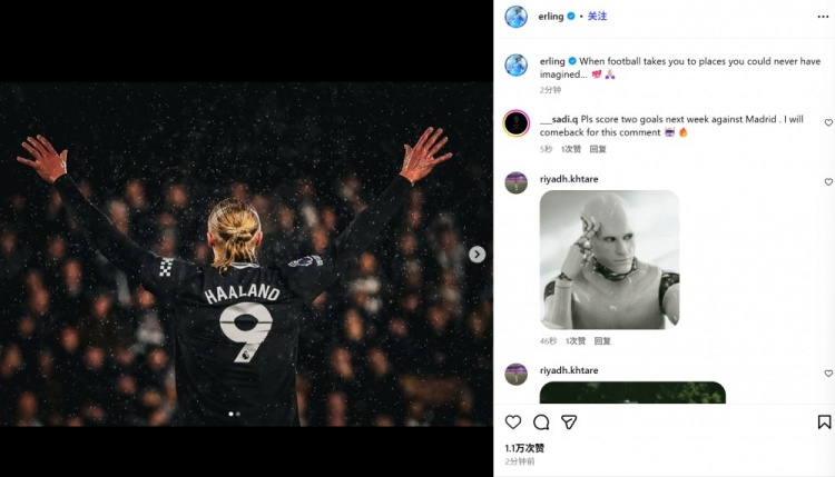 哈兰德社媒记挂英超100球里程碑:足球带我来到从未思象过的所在
