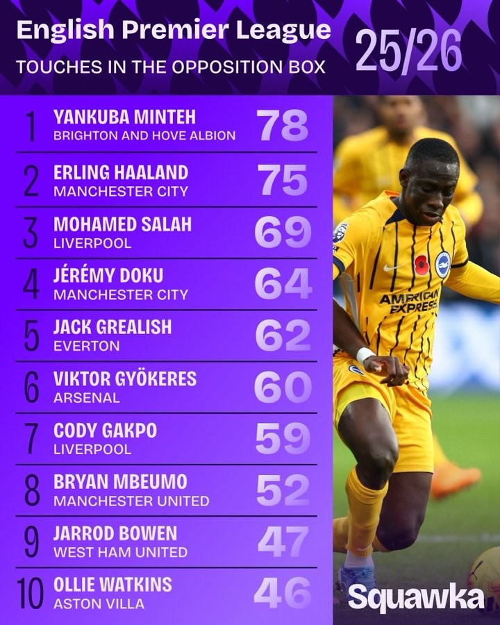 本赛季英超在对方禁区内触球榜: