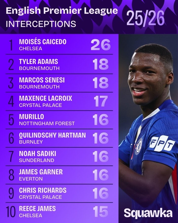 1.莫伊塞斯·凯塞多,切尔西,26次