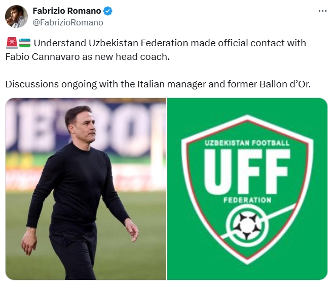 罗马诺:卡纳瓦罗获乌兹别克斯坦足协认真斗争,正洽商抓教国度队