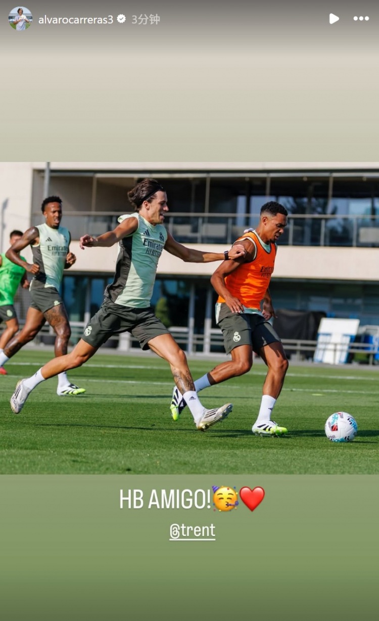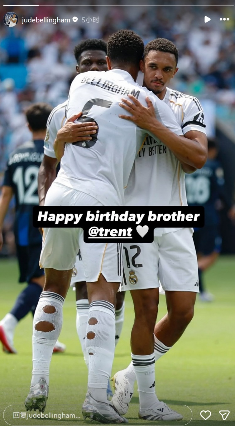 10月7日讯 今天是阿诺德27岁诞辰,皇骑兵友贝林厄姆、卡雷拉斯也纷纷在社媒晒出与阿诺德的合照为其奉上诞辰祝愿。