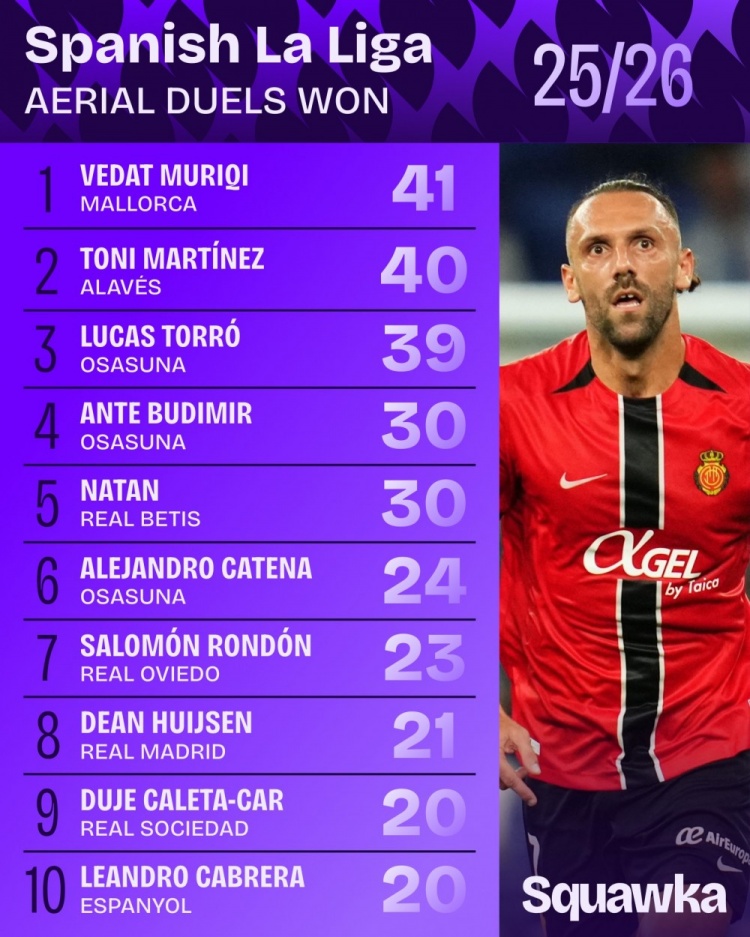 10月7日讯 日前,Squawka统计了本赛季西甲争顶成效次数名次,赫伊森21次位居第八。