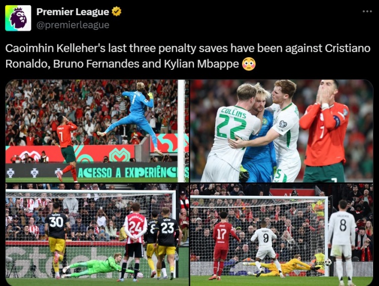 10月12日讯 英超官方发布数据,凯莱赫近3次扑点分手扑出了C罗、 B费和姆巴佩的点球。